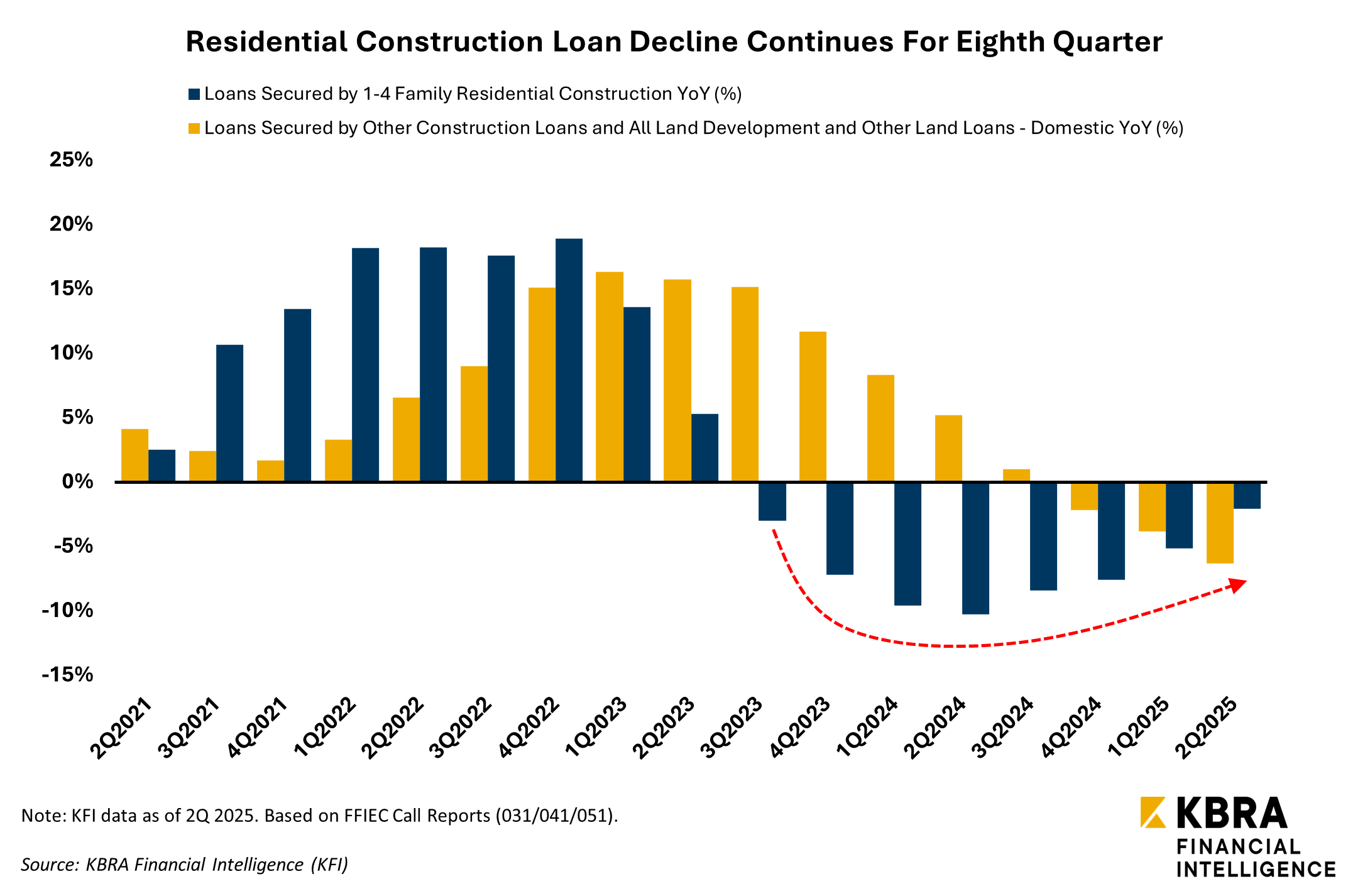 Call report data indicates that U.S. commercial banks have collectively experienced a year-over-year decline in loans secured by one- to four-family residential construction projects for eight consecutive quarters. After a prolonged softening of growth, other construction and land development loans have also receded alongside residential construction lending. The recent drop in this lending category marked the first decline in 11 years. The average delinquency rate impacting construction and development loans among U.S. commercial banks was 1.67% in 2Q 2025 – up 33 bps from the same quarter a year ago.