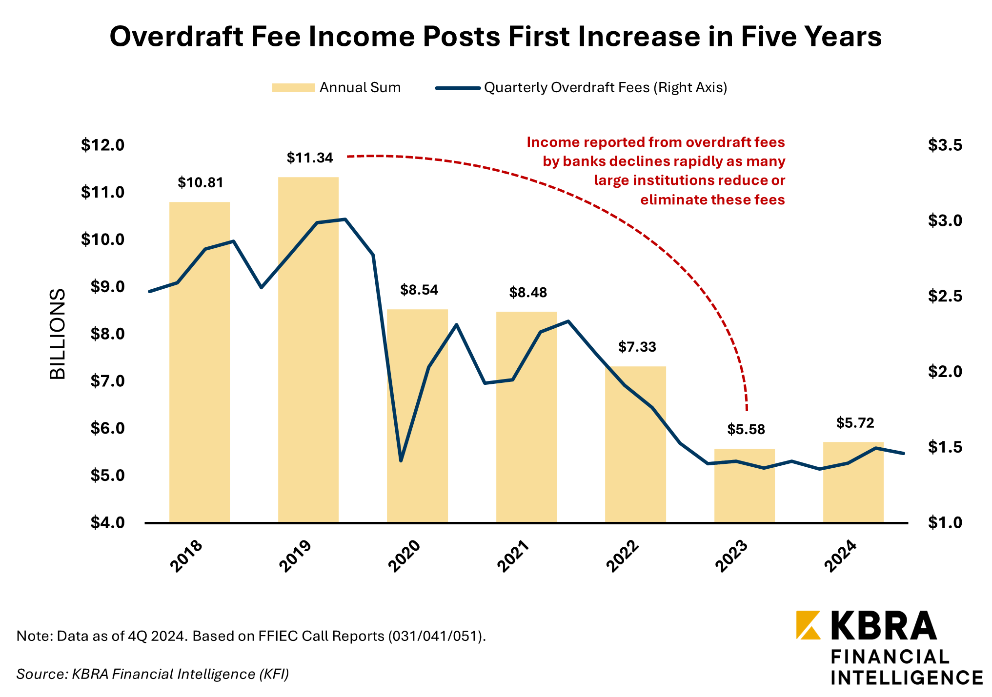 With turnover at the White House imminent following November 2024’s presidential election, the CFPB rushed to finalize nine new regulatory measures ahead of inauguration day, including a rule capping overdraft fees at $5—a substantial reduction from the $35 average overdraft fee reported in 2022. The bureau estimates the rule, which is scheduled to take effect in October 2025, to reduce consumer costs (and, therefore, bank revenue) by $5 billion annually. That is a significant figure, considering that banks collectively reported $5.7 billion in overdraft fee revenue in 2024. Notably, this figure may be understated as only banks with assets exceeding $1 billion are required to disclose noninterest income from service charges on deposit accounts.