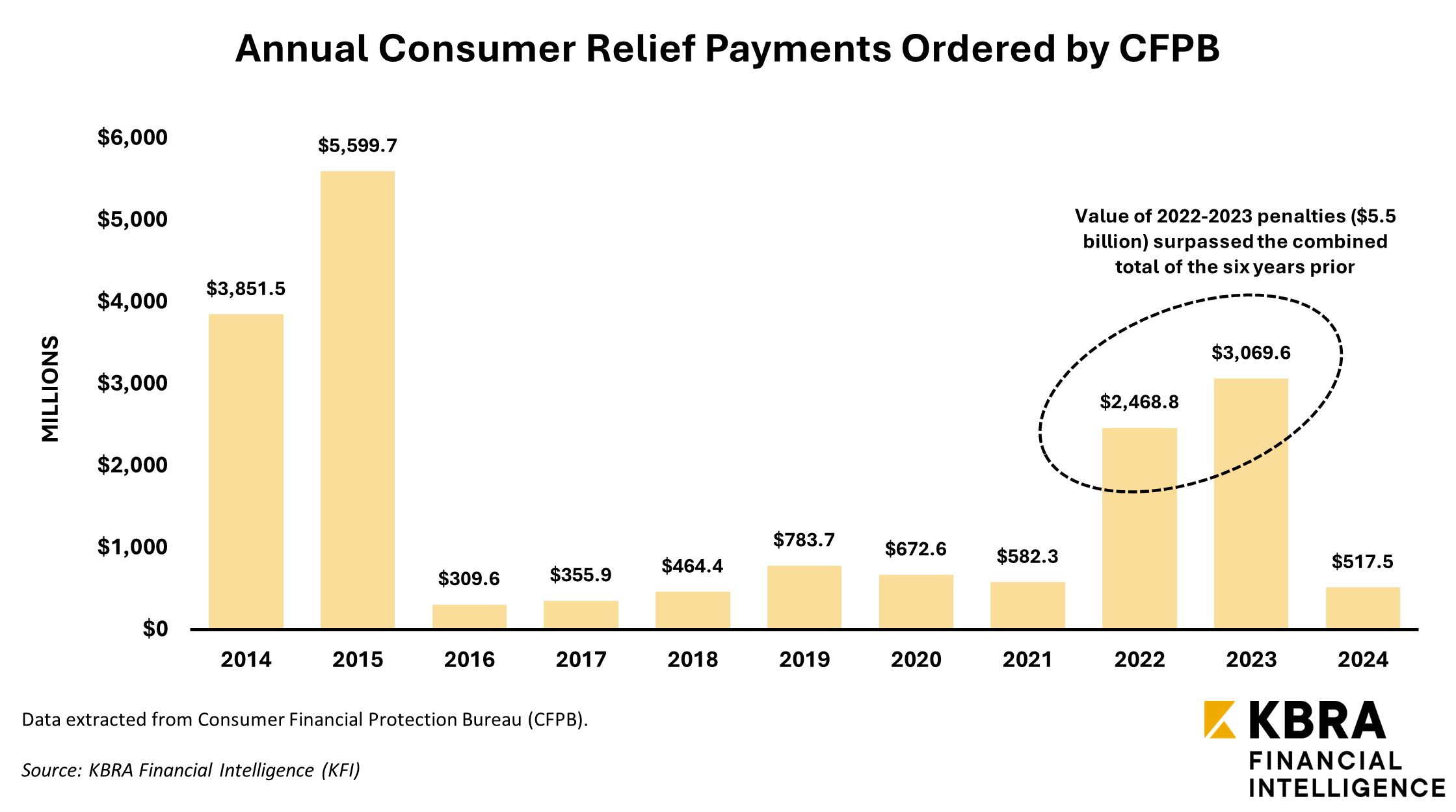 The CFPB has been accused of being an especially aggressive enforcer of consumer protection laws in recent years. In 2022 and 2023, consumer relief payments stemming from CFPB enforcement actions surged to their highest levels since 2015, prompting criticism from banking industry groups, which argued that financial regulation had become excessive. While the FDIC and OCC typically impose more modest annual penalties than the CFPB, their enforcement actions still resulted in more than $860 million in civil money penalties (CMP) in 2024, the highest total since 2020. These enforcement actions, along with those from the Federal Reserve Board (FRB) and National Credit Union Administration (NCUA), can now be tracked through KFI’s newly developed Dashboard, which allows users to filter cases by date, penalty amount, and institution.