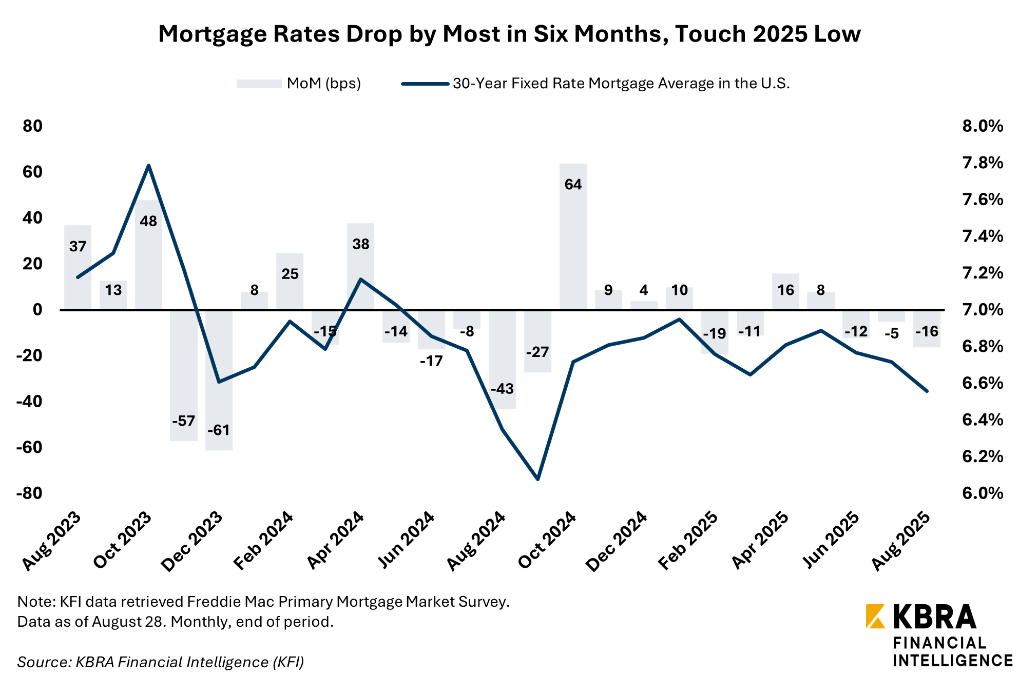 Per Freddie Mac’s Primary Mortgage Market Survey, the average interest rate on a 30-year fixed mortgage fell to a 2025 low of 6.56% in the final week of August. That drop capped a third consecutive monthly decline in mortgage rates and marked the second largest year-to-date. KBRA Financial Intelligence (KFI) noted that persistently high mortgage rates have likely deterred prospective buyers, many of whom may be postponing purchases in anticipation of more favorable borrowing conditions.