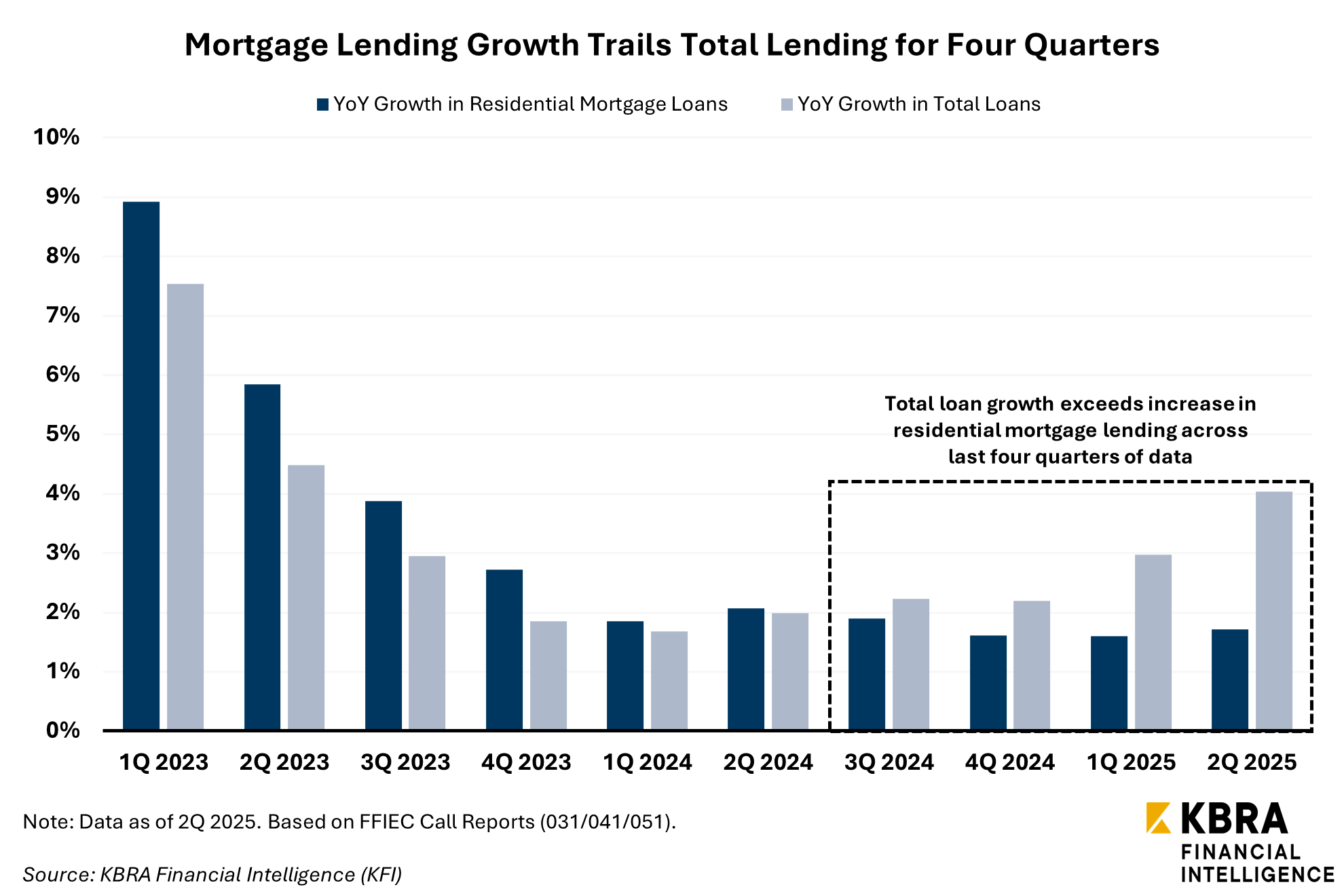 Call reports available on KFI’s bank and credit union data platform show that mortgage borrowing at U.S. banks remained relatively steady over the past year but continued to trail total loan growth in each of the last four quarters through 2Q 2025. While total loans held by U.S. banks increased by a two-year high of 4% in the latest quarter, mortgage lending has risen just 1.7%.