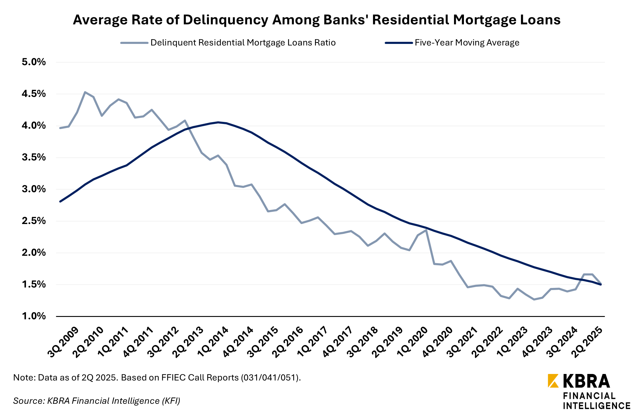 Among nearly 4,400 U.S. commercial and savings banks reporting residential mortgage holdings in 2Q 2025, the average residential mortgage delinquency rate was 1.52%. That is down 14 basis points (bps) from 1Q 2025, tying the largest quarter-over-quarter (QoQ) decline in four years. However, that delinquency rate remained slightly above the five-year moving average (MA) of 1.5% for a third straight quarter.