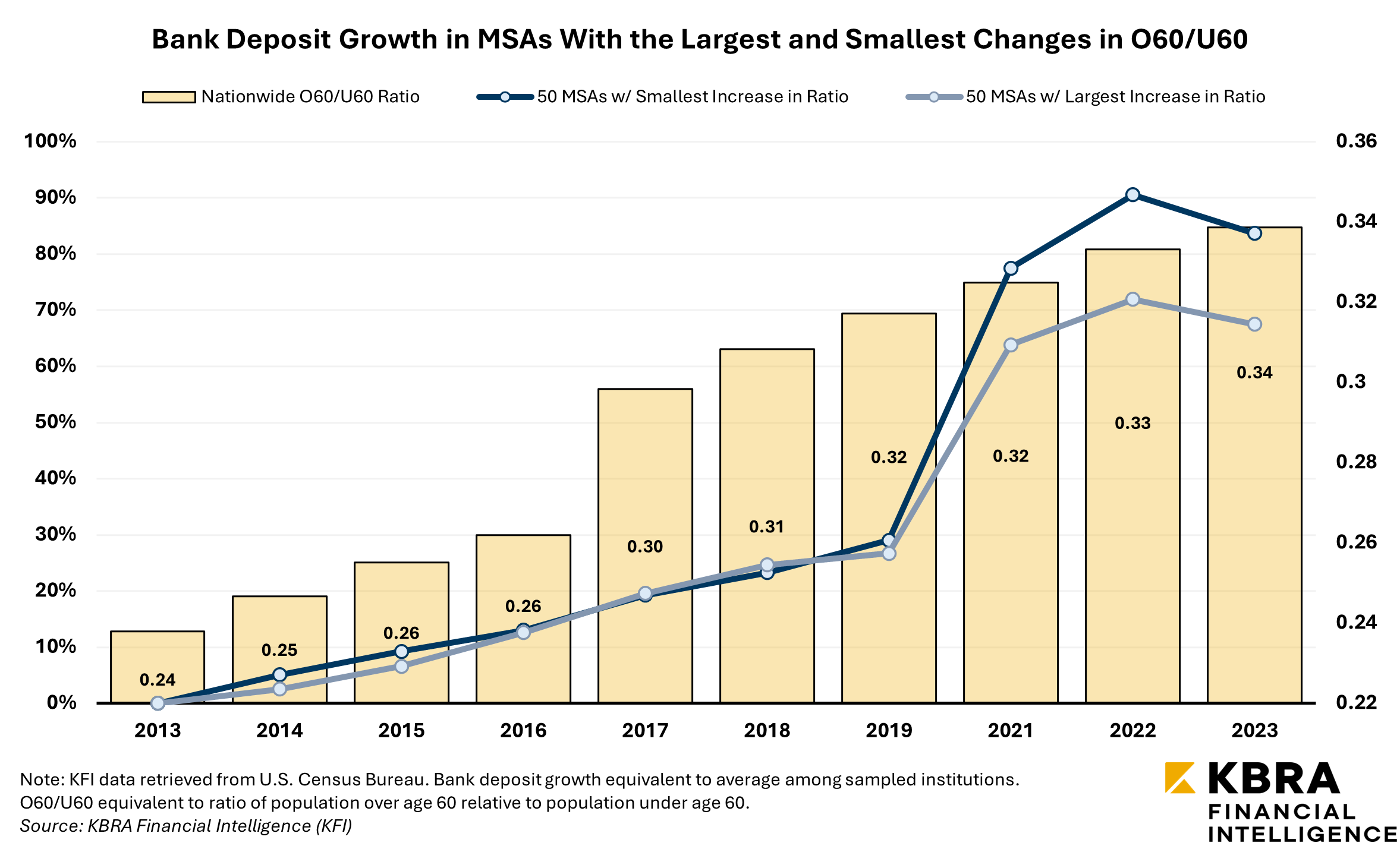 By utilizing FDIC Summary of Deposits (SOD) data available on KFI’s platform, we cross-referenced the O60/U60 ratio with deposit totals for 366 U.S. MSAs that have remained present in each year of Census data since 2013. Sampling two cohorts of 50 MSAs that experienced the smallest and largest increases in their respective O60/U60 ratios reveals a divergent path in deposit growth throughout the past decade, a trend that has become particularly prevalent since 2019. For simplicity, we will refer to MSAs experiencing the smallest increase in the O60/U60 ratio as the small change group (SCG) and MSAs experiencing the largest increase as the large change group (LCG) for the remainder of the analysis.