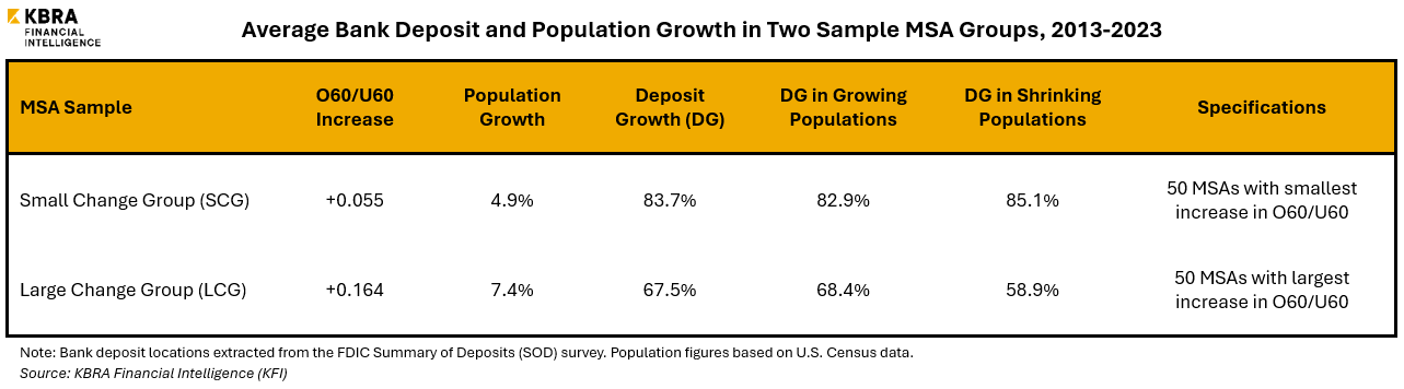 These results suggest deposit growth may be hampered in MSAs experiencing the most extreme cases of aging relative to areas undergoing a more moderate pace of aging. That relative weakness may be exacerbated when a population is not only aging but also declining.