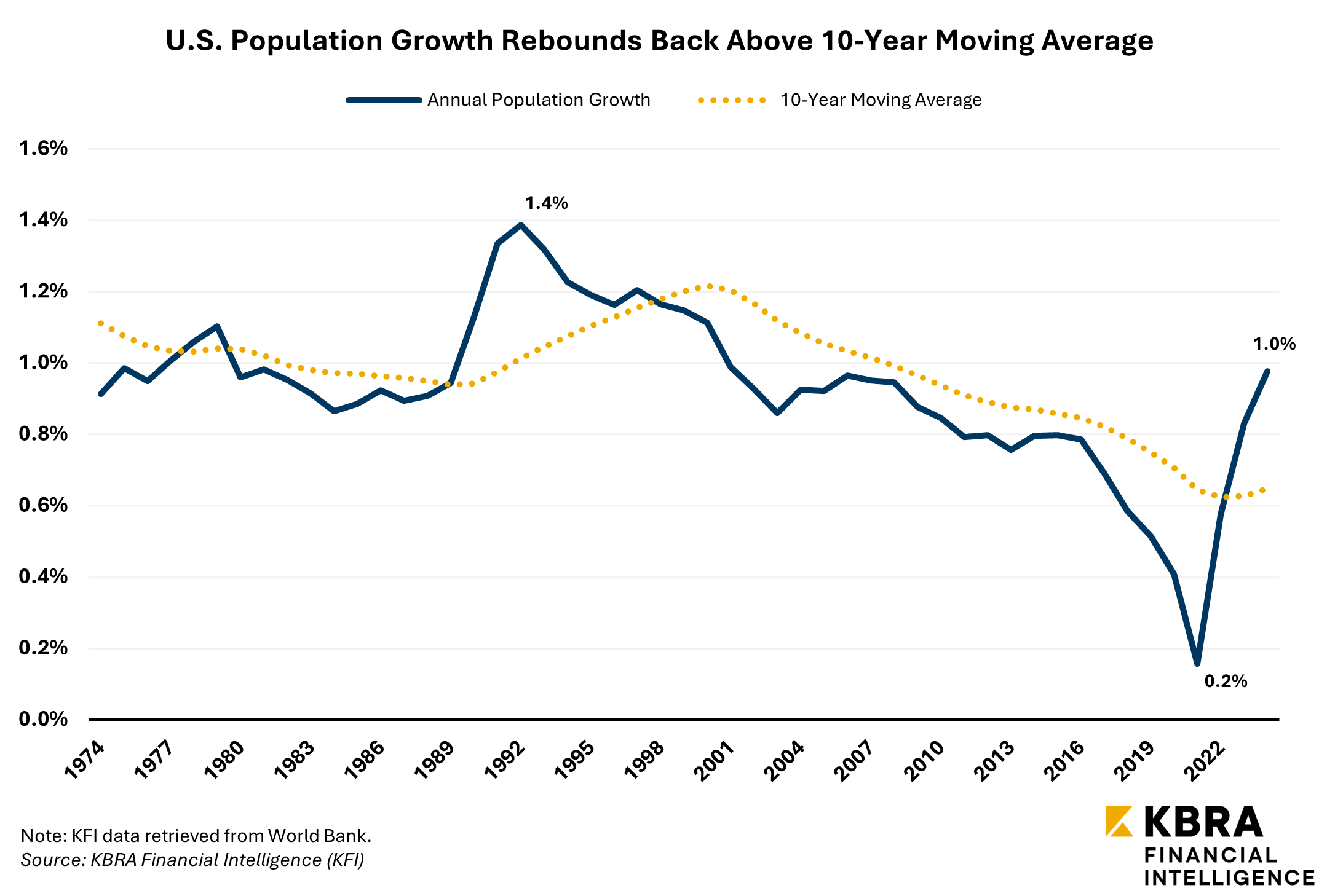 U.S. Census data indicates that American population growth has staged a rebound throughout the past five years, reaching a 23-year high in 2024 when the rate of growth surpassed the 10-year moving average for the second consecutive year. That said, the U.S. population continues to age, with the median age now exceeding 39 years. This marks a year-over-year increase in 329 of the nation’s 387 metropolitan statistical areas (MSA). According to the U.S. Census, older adults now outnumber children in nearly half of all U.S. counties.