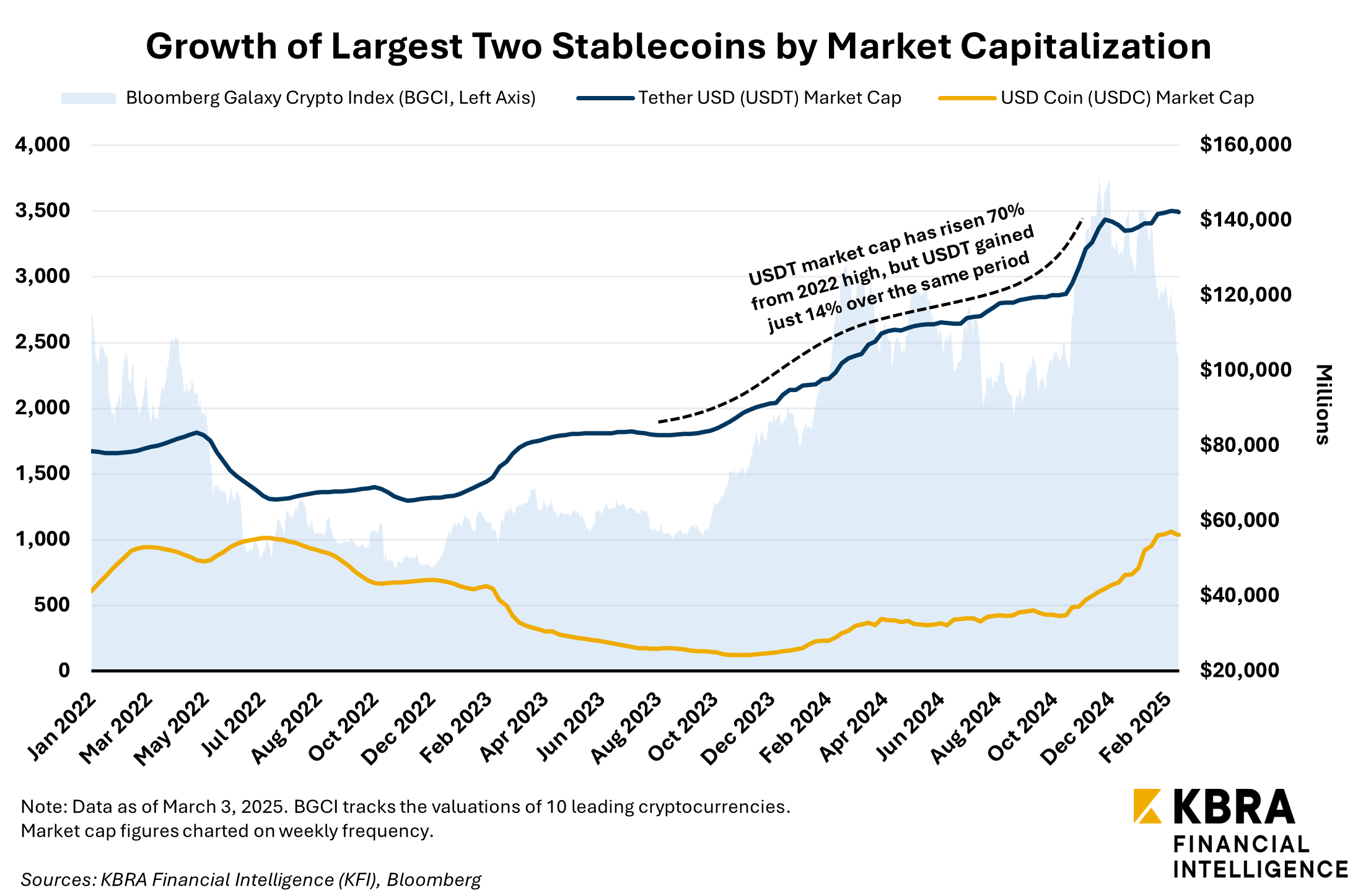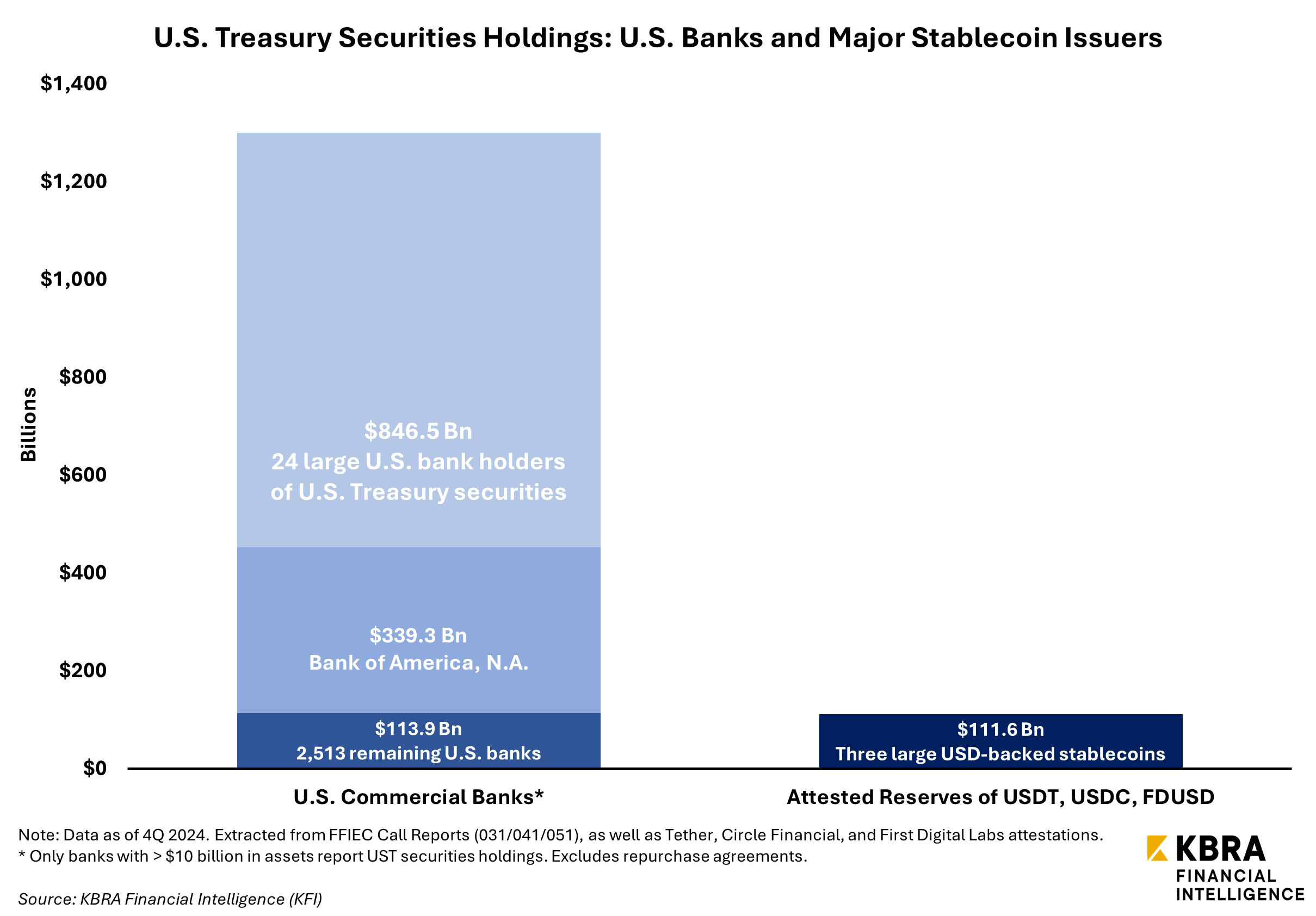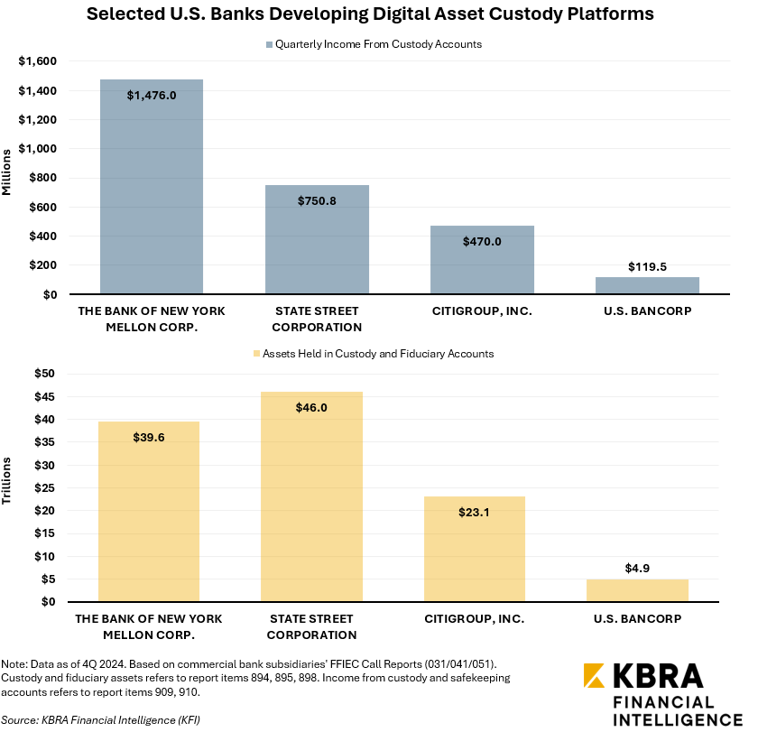 Additionally, Tether has employed U.S. asset manager Cantor Fitzgerald as a custodian for some amount of its UST reserves. Custody is a key service U.S. banks could provide in the digital asset space as well, as the OCC concluded in 2020 that national banks are permitted to hold stablecoin “reserves” as a service to bank customers. In December 2024, KFI highlighted the progress of several major U.S. custodian banks’ efforts to expand into digital asset custody.