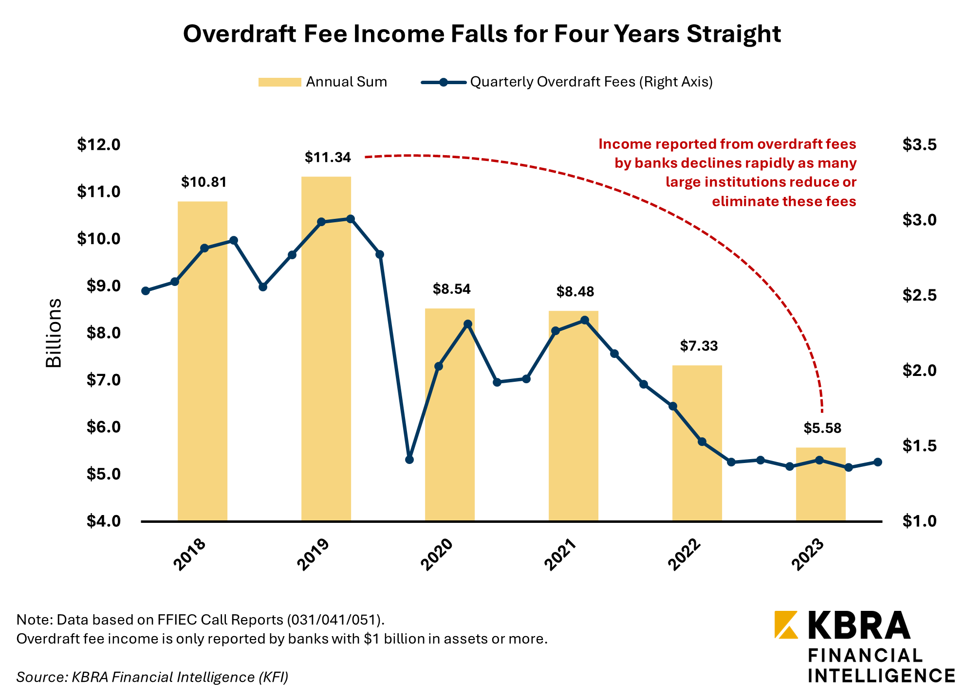 According to data from KFI, overdraft-related service charges generated nearly $2.8 billion in 1Q 2020, representing around 2.1% of total revenue among banks reporting such fees. This figure may be understated, as only banks with assets exceeding $1 billion are required to disclose noninterest income from service charges on deposit accounts.