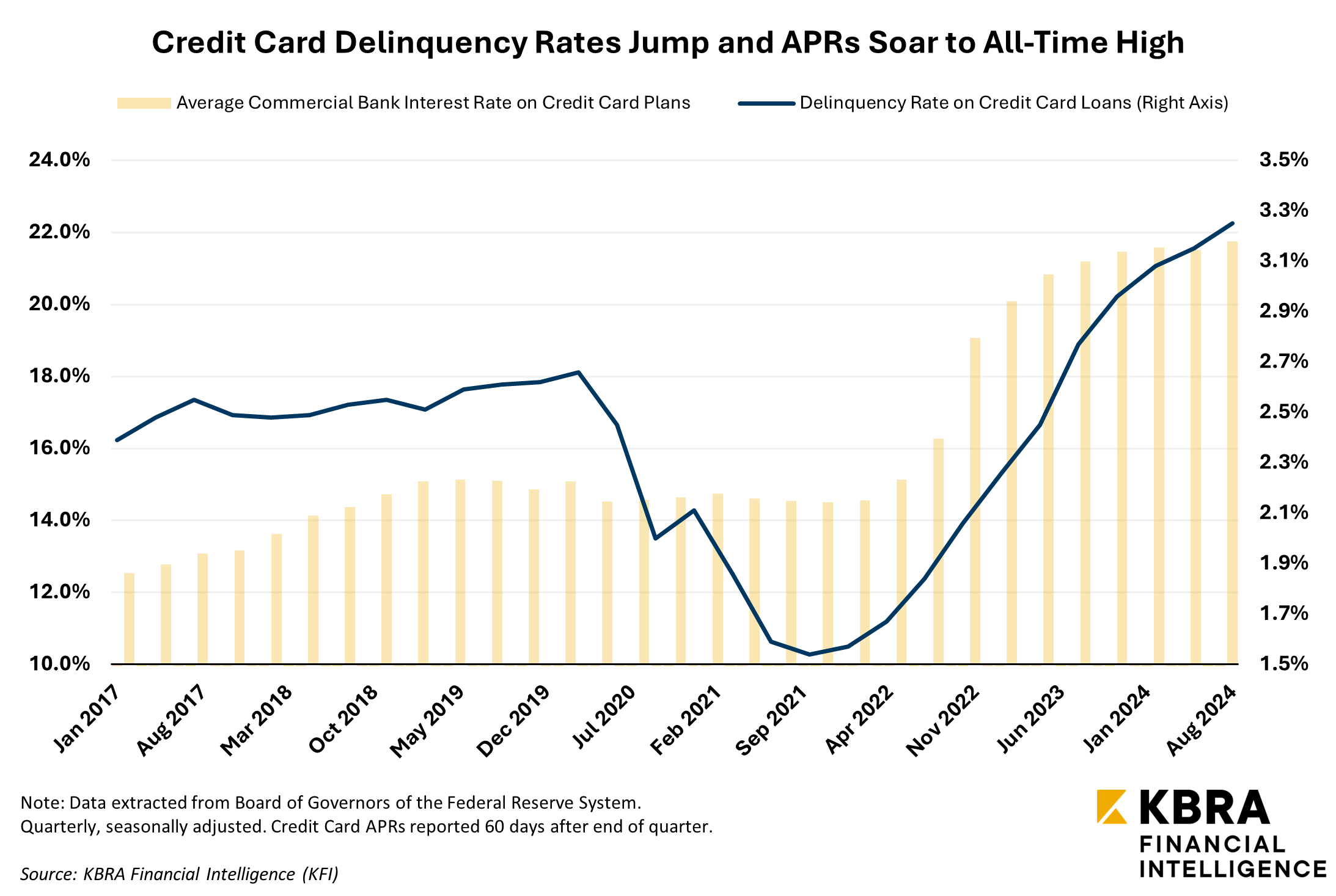 A proposal from the Trump campaign would establish a temporary cap on credit card APRs at 10%, below the current 21.8% average rate, aiming to provide debt relief for consumers in light of recent inflation trends. This initiative addresses the substantial increase in outstanding credit card debt, which has risen by over 25% (or $330 billion) since early 2021. Earlier this month, KFI noted that U.S. credit card debt and revolving plans surpassed $1.07 trillion, continuing to grow at a 5.4% year-over-year rate as of last month. Since hitting a low point in 3Q 2021, credit card delinquencies have more than doubled, reaching a 12-year high of 3.3% and outpacing increases in other loan categories. Additional insights, including delinquency rates across various loan types by individual banks and credit unions, are available through KFI’s Loan Category and Delinquency Report template in the Template Library.