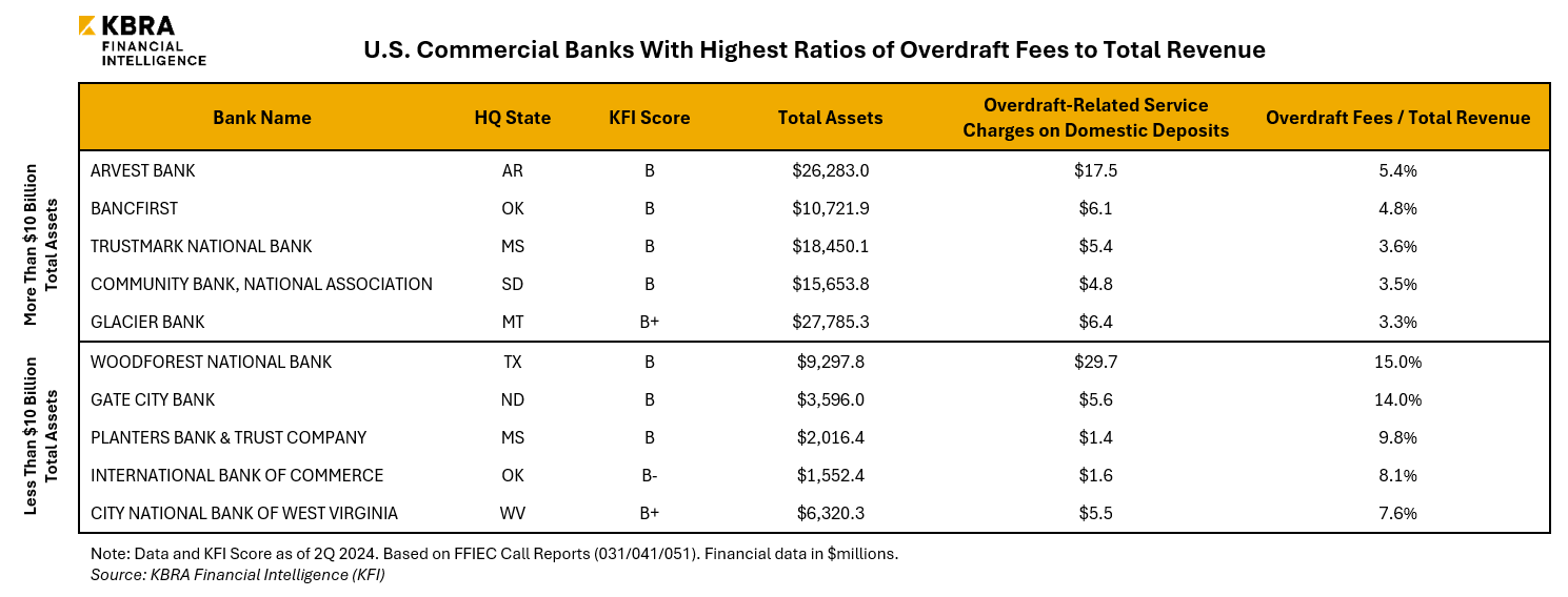 Even without new overdraft regulations in place, several large U.S. banks have already willingly eliminated or reduced overdraft fees. Major banking industry names such as Ally Bank (KFI Score: B), Capital One, N.A. (KFI Score: C+), and Citibank, N.A. (KFI Score: B) have ended the practice of charging these service fees outright, while Bank of Montreal, N.A. (KFI Score: B) cut its overdraft fee in half in 2022. The annual sum of revenue earned from overdraft fees declined sequentially across each year from 2020-2023, falling to $5.6 billion from $11.3 billion throughout the period. Based on 1H 2024, this year is on track to see annual overdraft fees decline once again. However, some institutions have remained resistant to winding down their overdraft programs—either to compete for small deposit accounts that may be susceptible to overdrafting or in anticipation of a legislative crackdown. For example, Woodforest National Bank (KFI Score: B) collected 15% of its 2Q 2024 revenue in the form of overdraft-related fees, leading all U.S. banks in this metric. Woodforest currently charges $32 each time an account is overdrafted by more than $1, but the bank would be exempt from the proposed CFPB overdraft rule, as it only carried total assets of $9.3 billion in 2Q 2024. If the bank continues to grow and surpasses $10 billion in assets, it could potentially become subject to lower benchmark fees in the future.